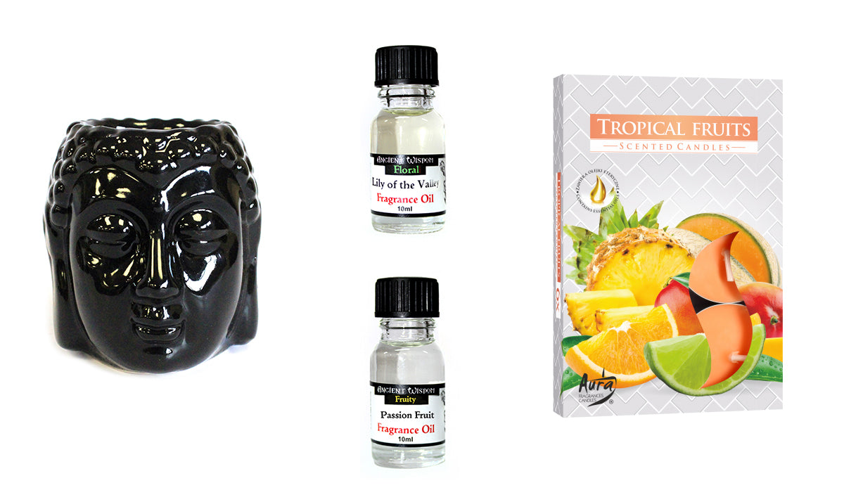 Add warmth and fragrance to your home. You will get: Black Buddha's Head Oil Burner - This oil burner has been finished to a high standard. Simply add a few drops of fragrance oil or wax melt in the bowl, place and light a tea light candle in the base or the burner and enjoy the aroma! Set of 6 Scented Tealights - Tropical Fruit - 4h burning time each Fragrance oils in Lily of the Valley and Passion Fruit - Our fragrance oils have been specifically formulated to create a long-lasting scent, perfect for oil burners and diffusers. A set to be proud off at a price to make you smile.