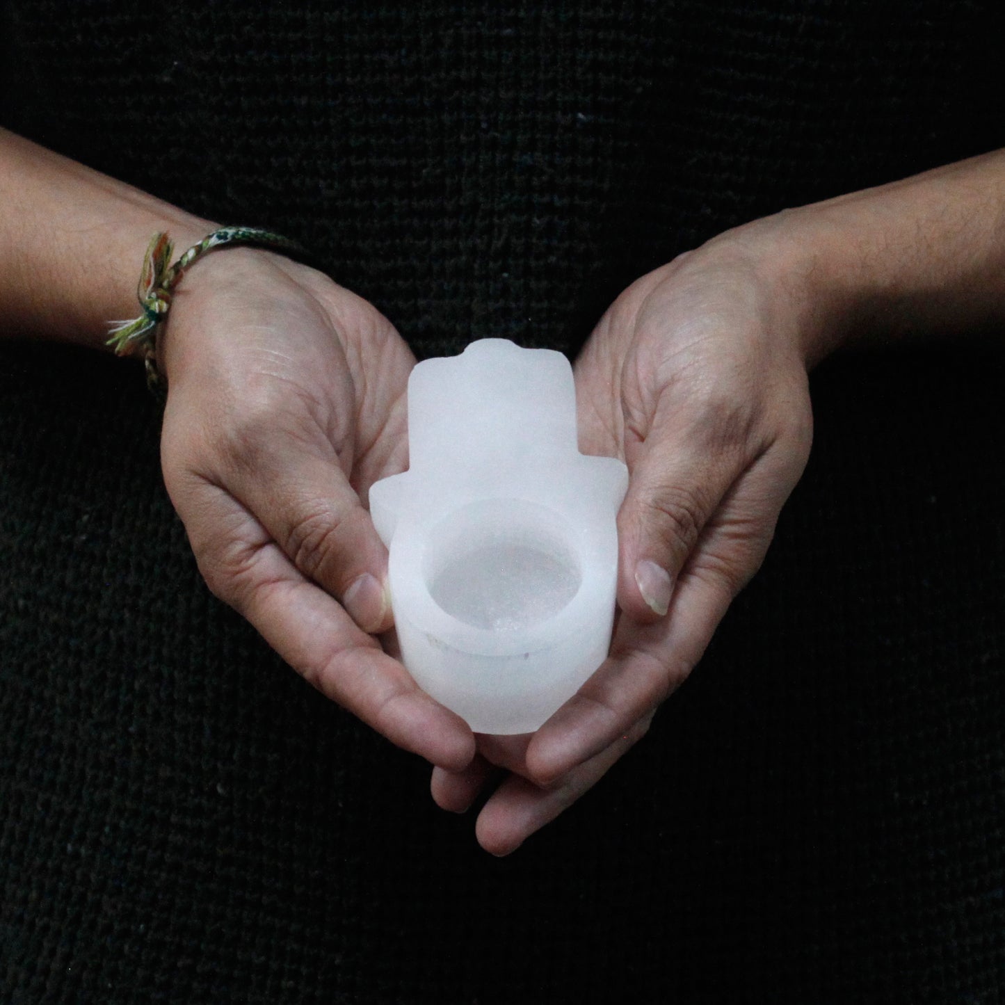 Selenite Hamsa Candle Holder. Size: width 10cm, Lengh 6.5cm, Height 3.5cm.