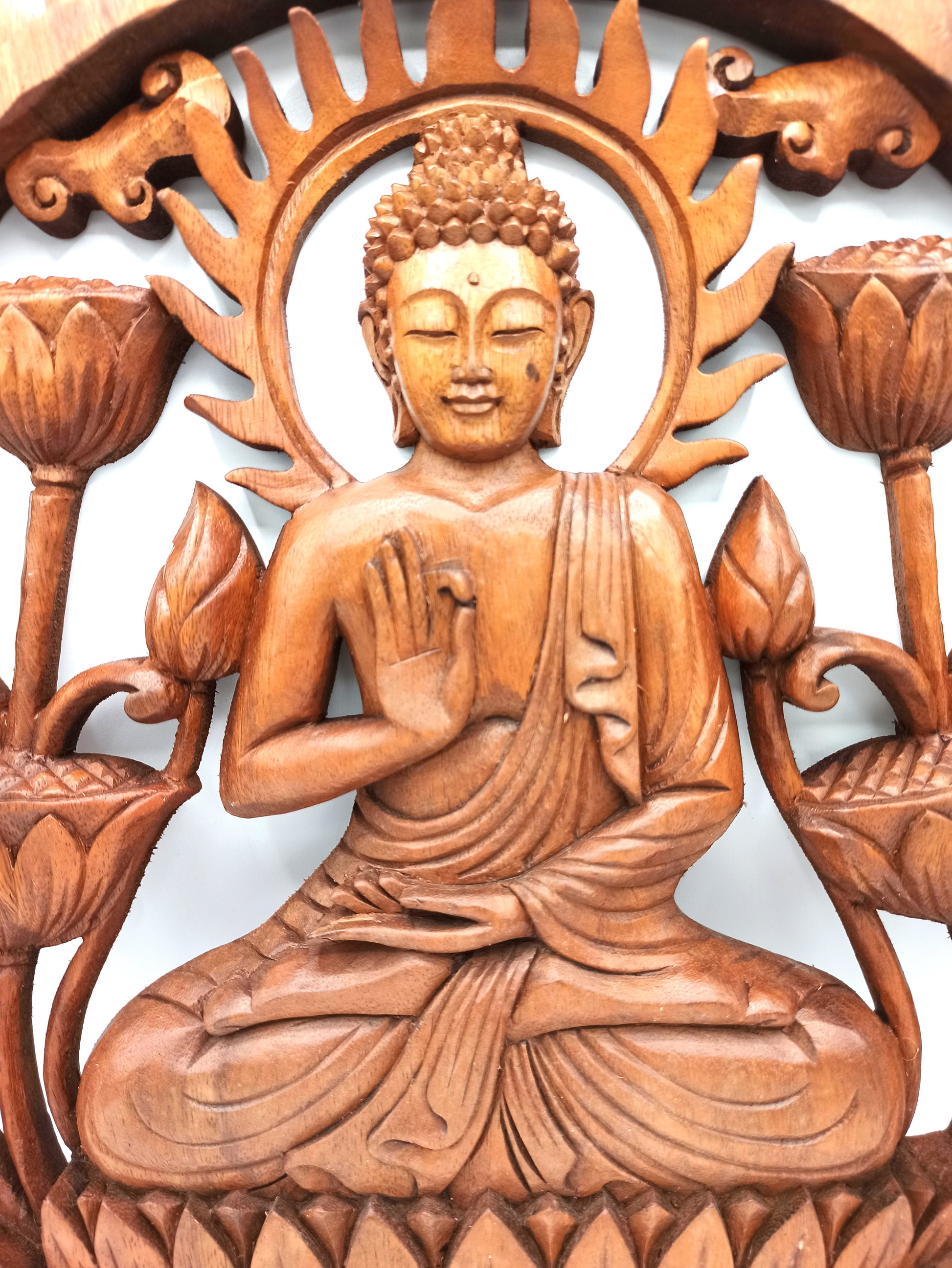 Decorative Wooden Panels are hand-carved in 100% sustainable Suar wood by Indonesian artisans. Each wooden panel is unique piece of art, 40cm diameter makes it an ideal wall decoration which will add a calming and relaxing touch to any room. The wood is seasoned and finished with a nice natural looking colour that will suit any interior. Considering how much talent and care goes into each panel, these natural works of art represents brilliant value for money. NB: We can get only limited supplies as the artisans can only make one piece per day. So may be out of stock at times. Product code: WDW-05